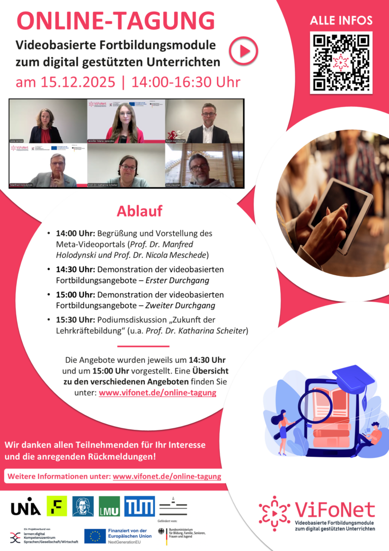 Auf dieser Seite finden Sie alle Informationen zur Online-Tagung „Videobasierte Fortbildungsmodule zum digital gestützten Unterrichten“ des Verbundprojekts ViFoNet.